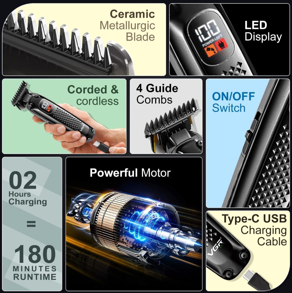 Achieve a clear cut with the efficiency of T-SHAPE BLADES Trimmer has a smart LED Display who shows the power left status (oil & charging indicator) Trimmer has premium ABS body